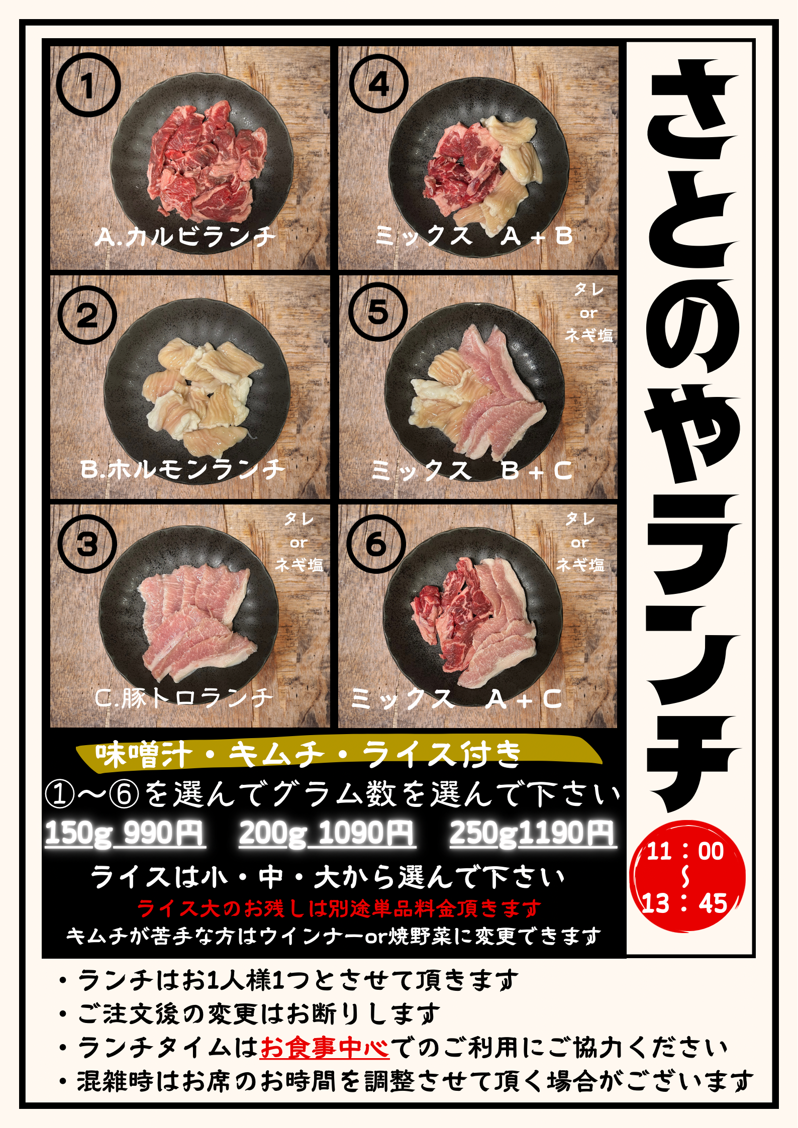 お肉の種類と量とご飯の量などランチメニューの内容をご紹介いたします。