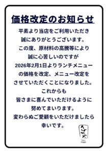 平素より当店をご利用いただき、誠にありがとうございます。原材料価格の高騰に伴い、大変心苦しいのですが、2026年2月1日よりランチメニューの価格および内容の一部を改定させていただくこととなりました。 今後も皆さまにご満足 […]
