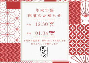 平素よりご愛顧いただき、誠にありがとうございます。当店は 年内は12月30日まで営業、新年は1月4日より通常営業いたします。 本年も多くのお客様に支えていただき、心より感謝申し上げます。来年も皆さまに喜んでいただけるサー […]