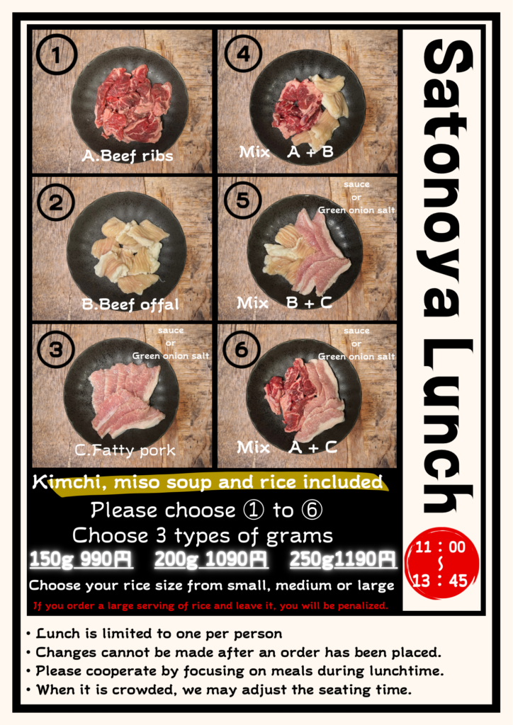 - ご注文後のお肉の種類と量、ご飯の量の変更は出来ません。